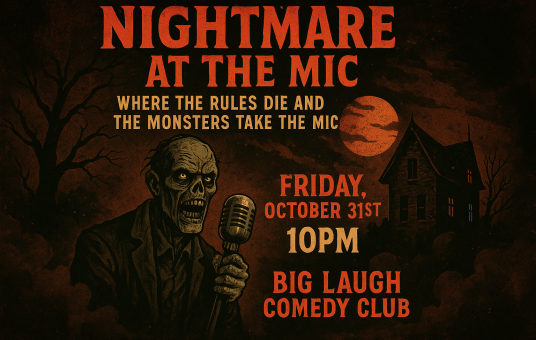 • Nightmare at the MicThe later it gets, the darker it gets.When the clock strikes 10, Big Laugh Comedy Club transforms into a haunted playground of chaos, debauchery, and unfiltered stand-up.Welcome to Nightmare at the Mic! The 21+ late-night Halloween comedy event where monsters take the stage and the jokes get downright sinful.Expect filthy laughs, dark jokes, and a few surprises straight from hell. During the “Trick or Treat” round, comics pull from a cauldron for a random dare, roast another comic, do a bit blindfolded, or chug a spooky shot on stage.Costumes are encouraged. Morals are optional.You’ve been warned.Showtime: Friday, October 31 @ 10 PMLocation: Big Laugh Comedy Club — 604 Main St, Fort Worth, TX21+ OnlyThe jokes get darker after midnight.Get your tickets before they vanishDoors open at 9pm | Show starts at 9:30pm**2 Drink Minimum Per Person**The show is for 18+. Must present IDs at the door.The show runs for 90 minutes long.Garage Parking OptionsCity Center Garage #2 - 400 Jones StreetFree on weekdays (6 PM - 3 AM) & weekends Friday 6 PM - Monday at 3 AM)The Tower Garage - 400 Taylor StreetFree on weekdays (6 PM - 3 AM) & weekends Friday 6 PM - Monday at 3 AM)Street Parking Options Downtown parking meters are free every night after 6pm and on weekends!Ticket Info- 2 Drink Minimum per person- 20% Gratiuty added to your bill- First come, first serve GA and Preferred seating- There are no refunds - This event is 18 and up, valid ID required- If you don't show up 20 MINUTES after the scheduled show time, you will forfeit your tickets- No heckling or videos during the show, if you can't play nicely you will be asked to leave - There is absolutely NO VIDEO RECORDING whatsoever - No backpacks or other large bags allowed in venue- No animals allowed in venue- Make sure to have fun and be respectful during the show  Grab your tickets before you are stuck wishing you had. Get them now!