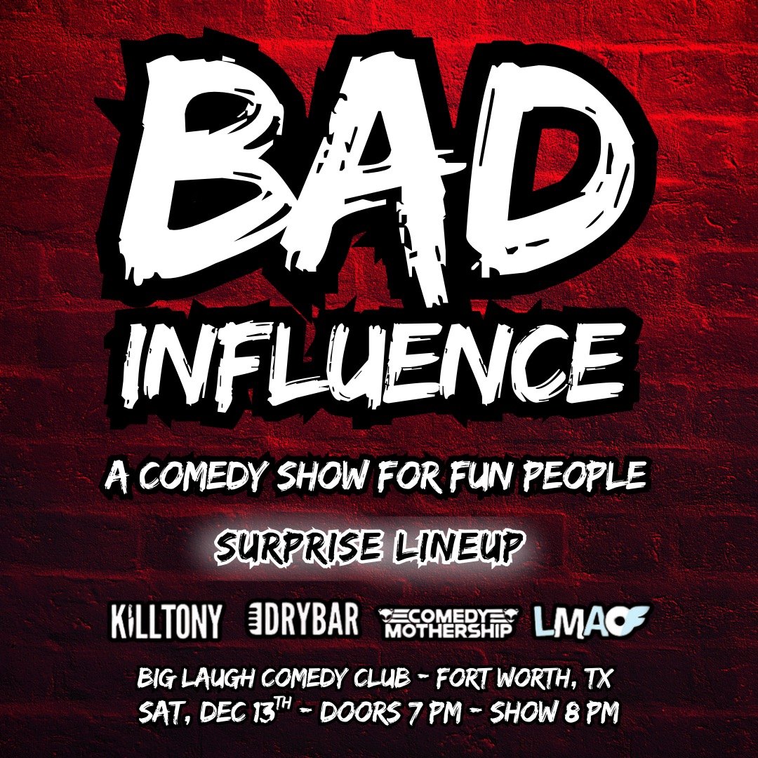 Bad Influence is your backstage pass to a night of high-level, unfiltered, and absolutely hilarious comedy. No safe sets. No fluff. Just straight-up killers from shows like Kill Tony, Comedy Mothership, Drybar, and LMAOF, all packed into a secret lineup so hot it’s borderline criminal.