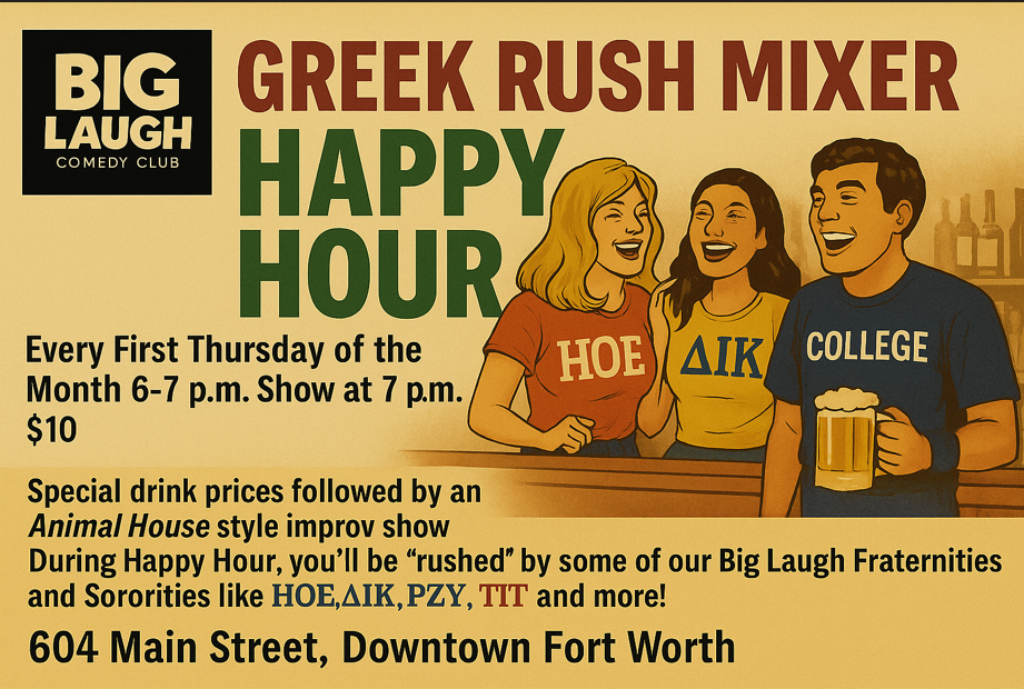Come grab a drink, join the madness, and let our hilarious “fraternities” rush you into the funniest hour of your life.