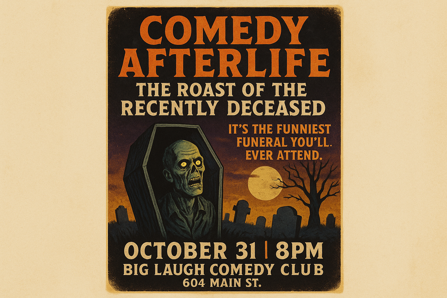 Part stand-up showcase, part dark-comedy funeral. Each comic performs their tightest set, then roasts the “recently deceased” — from horror icons to Fort Worth legends. It’s the funniest funeral you’ll ever attend.